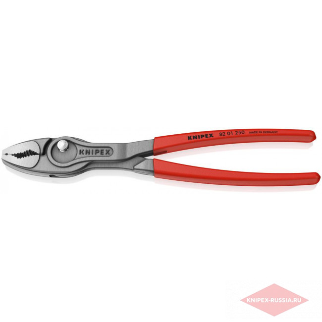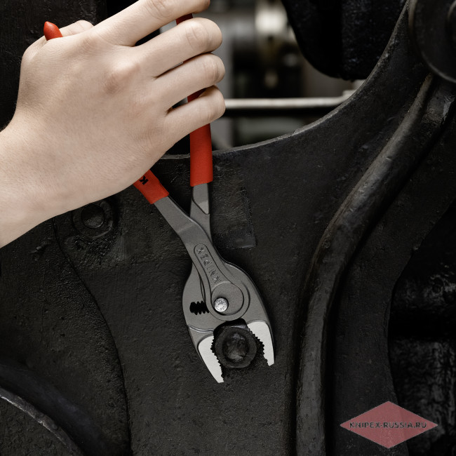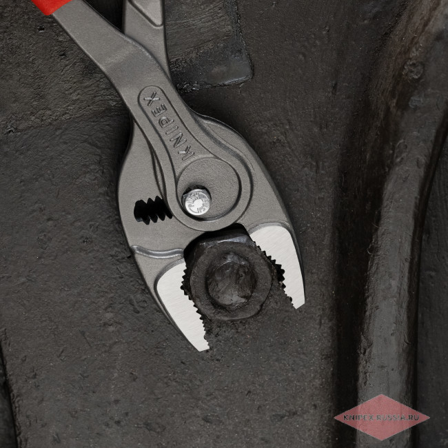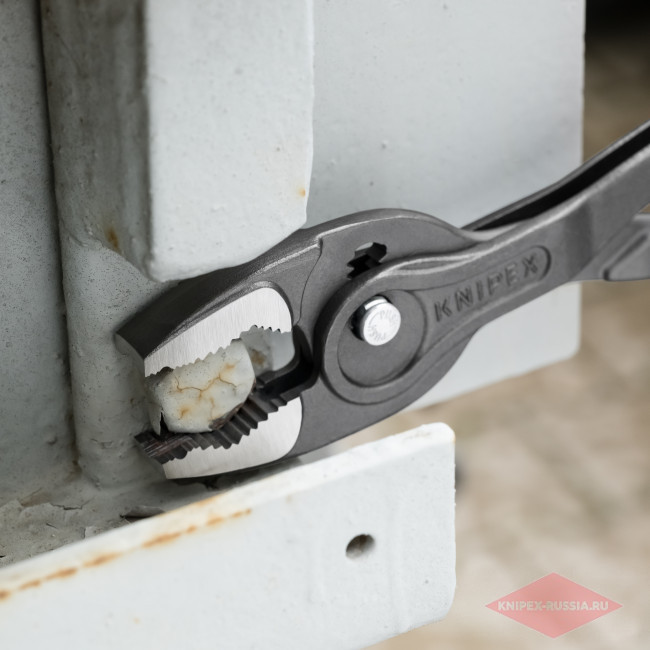 82 01 250 KNIPEX TwinGrip Захват, затягивание и ослабление винтов с изношенными головками и резьбой. Уникальное сочетание: функция переднего и бокового захвата, коробчатый шарнир, регулировка нажатием кнопки. Передняя губка с мощным захватом, крепкими зубьями и высоким коэффициентом сцепления на верхушке губок. Очень тонкие клещи: работают даже в ограниченном пространстве, имеют узкую зону вращения для быстроты вращения. Надежный фронтальный захват плоских деталей толщиной до 10 мм благодаря трехточечной системе. Регулируемый в семи направлениях скользящий шарнир с кнопкой регулировки для точной регулировки силы захвата. Упор снижает риск защемления пальцев. Долговечность и устойчивость благодаря прочному коробчатому шарниру. Мощный захват даже больших, очень тугих и глубоко установленных деталей с размером под ключ 5–27 мм. - положения регулировки: 7 - Параметры для труб (диаметр): Ø 1/16 – 13/64in - Параметры для труб (диаметр): Ø 5 – 27mm - Диапазон для гаек, размер под ключ: 5 – 27mm. Преимущества: